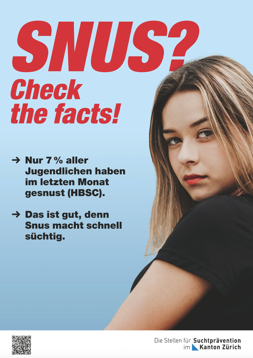 Wenn im Umfeld viel gesnust wird, kann das als «normal» wahrgenommen werden und den Druck erhöhen, es selbst auszuprobieren. Fakt ist: Bei den 15-Jährigen sind es im Durchschnitt 7%, die Snus konsumieren (laut HBSC), Jungen häufiger als Mädchen. Das sollte mit den Jugendlichen thematisiert werden. Anregungen für ein Gespräch darüber findet sich in unserem Factsheet.